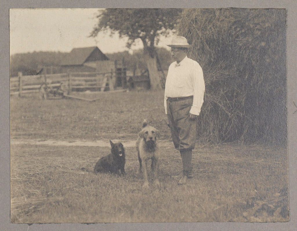 Theodore Roosevelt standing with two dogs next to haystack. Source from Library of Congress.