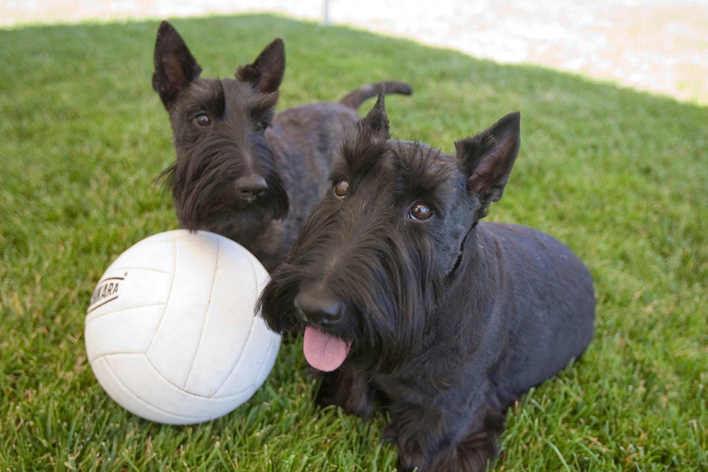 Barney and Miss Beazley took a break from playing with their volleyball on the South Lawn of the White House, June 13, 2006. Photo from George W. Bush Presidential Library and Museum.