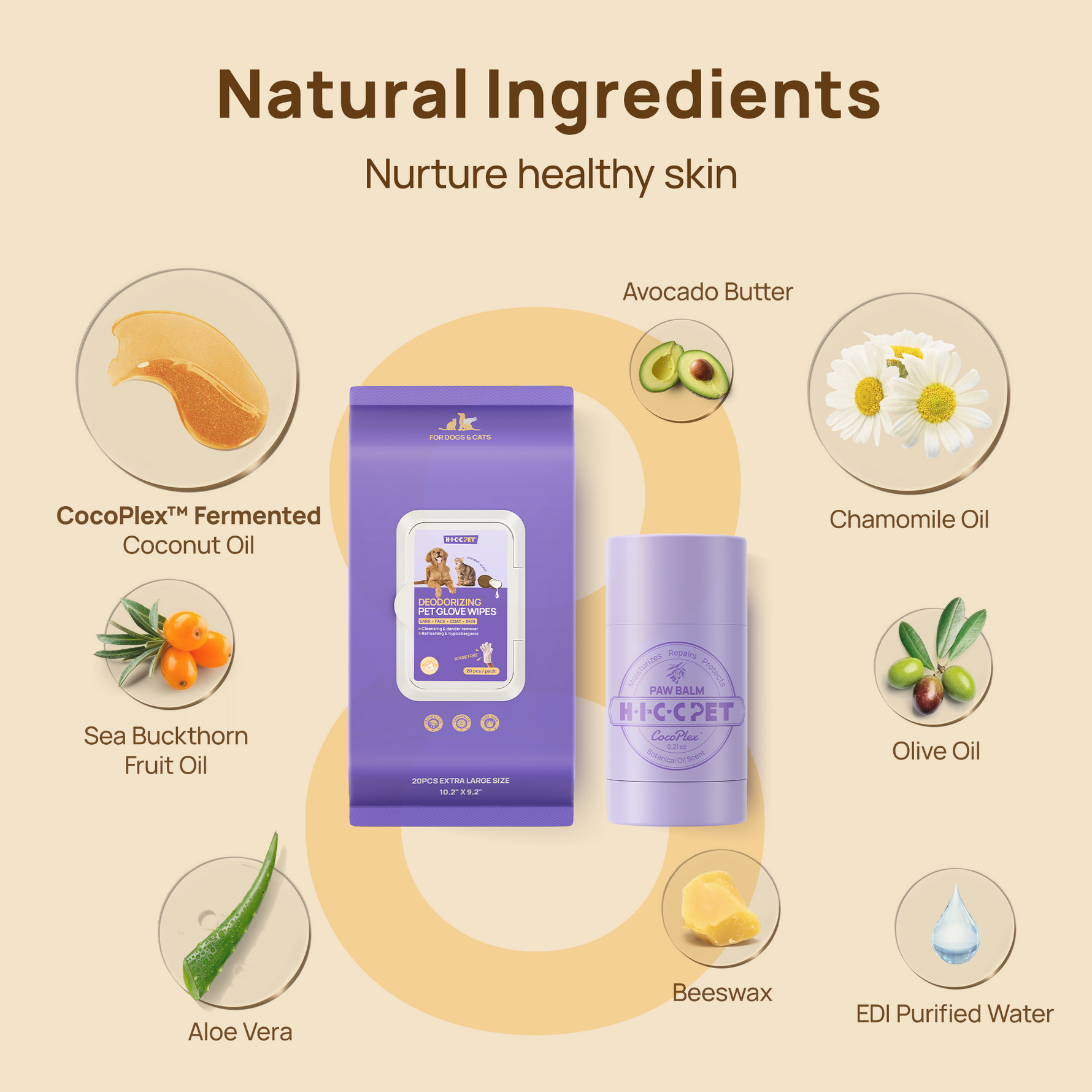 • The glove wipes, enriched with fermented coconut oil, aloe barbadensis leaf extractand other natural plant-based ingredients, effectively remove dirt, odor, and allergens from your pet’s paws and body. The wipes’ soft, textured glove design allows you to easily clean between paw pads while nourishing and refreshing your pet’s skin.