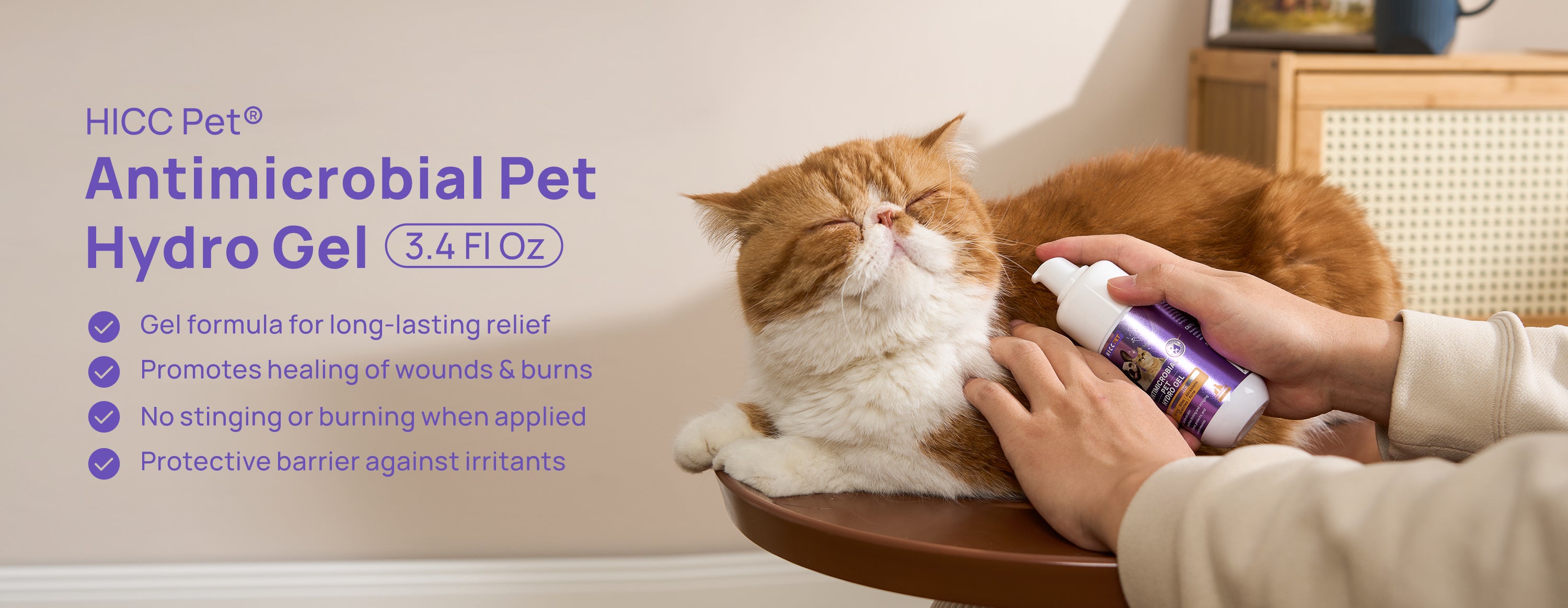 HICC Pet Antimicrobial Pet Hydro Gel is formulated with Hypochlorous Acid to clean, protect, and help heal rashes, cuts, irritations, bites, and burns. The gel creates a protective barrier that shields against irritants, reduces friction, and locks in moisture for better skin health.