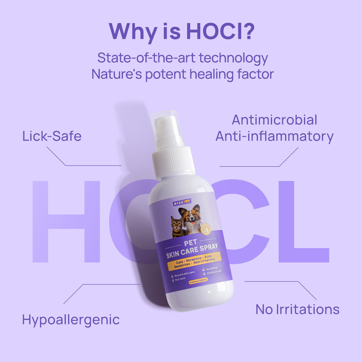 HICC Pet Skin Care Spray is intended to help aid in the management of rashes on intact skin as well as minor abrasions, lacerations, irritations, cuts, and burns. It can be used in both dogs and cats, and is generally considered safe if licked by animal.